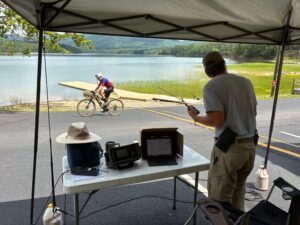 RVARC participated in the 2025 USA Cycling Endurance Mountain Bike National Championships on July 14. The race started at Hollins University and wove through the mountains, around Carvins Cove, and finished at Hollins University.  We had 3 stations and two rovers.  Stations were at Hollins University Command Center, The Red Barn, and the boat dock at Carvins Cove.  Mike K2JML Luger was the organizer of this event. We helped with communication so that the bikers could be followed throughout the trail and finish the race safely.  That’s what amateur radio is about–helping out where needed in the community.